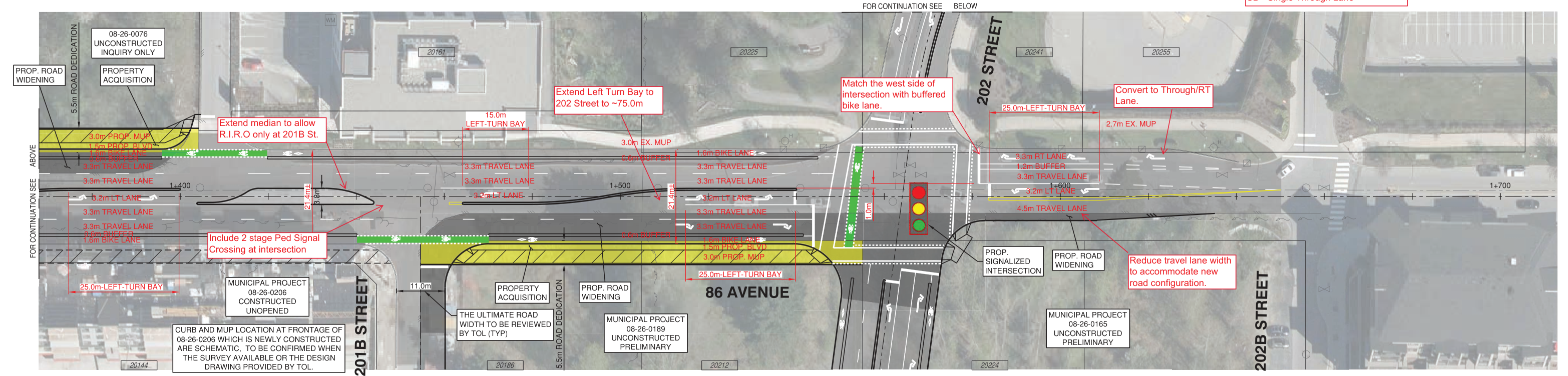 This is the full conceptual design from Report 24-133, showing the planned improvements to 86 Avenue from 200 Street to 202 Street, including the traffic signal at the 202 Street intersection.
