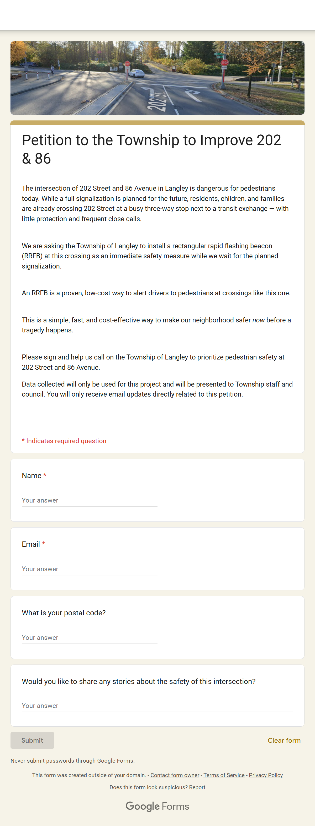 On April 26, 2025, Strong Towns Langley launched a community petition campaign asking the Township to install a Rectangular Rapid Flashing Beacon (RRFB) as an immediate safety measure while waiting for the planned signalization project.